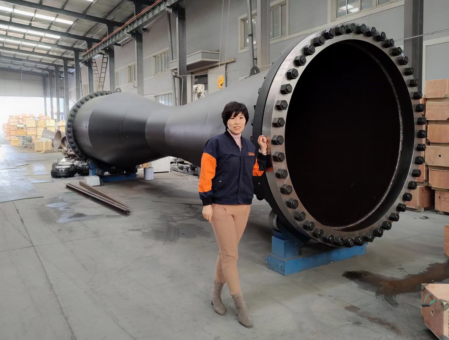 Photo/ General Manager Zhang Yiding with the completed 18m calibre Venturi flowmeter.
